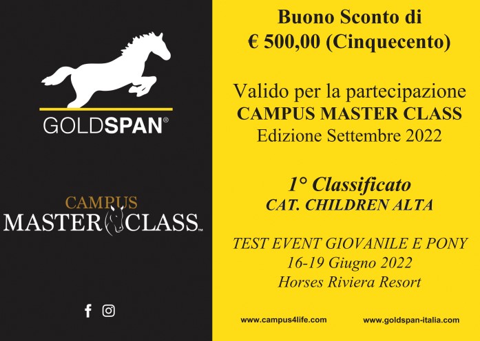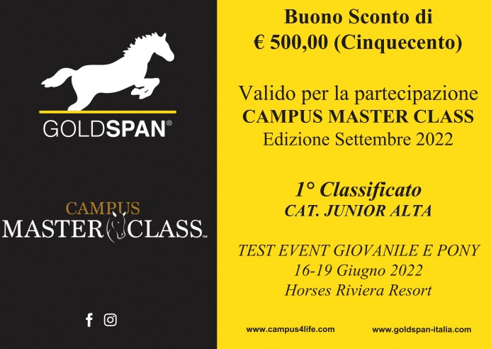 In Collaborazione con Campus Master Class, Goldspan Italia ha inoltre assegnato 3 Buono Sconto del valore di euro 500,00 validi per la partecipazione alla prossima edizione di Campus Master Class (settembre 2022):